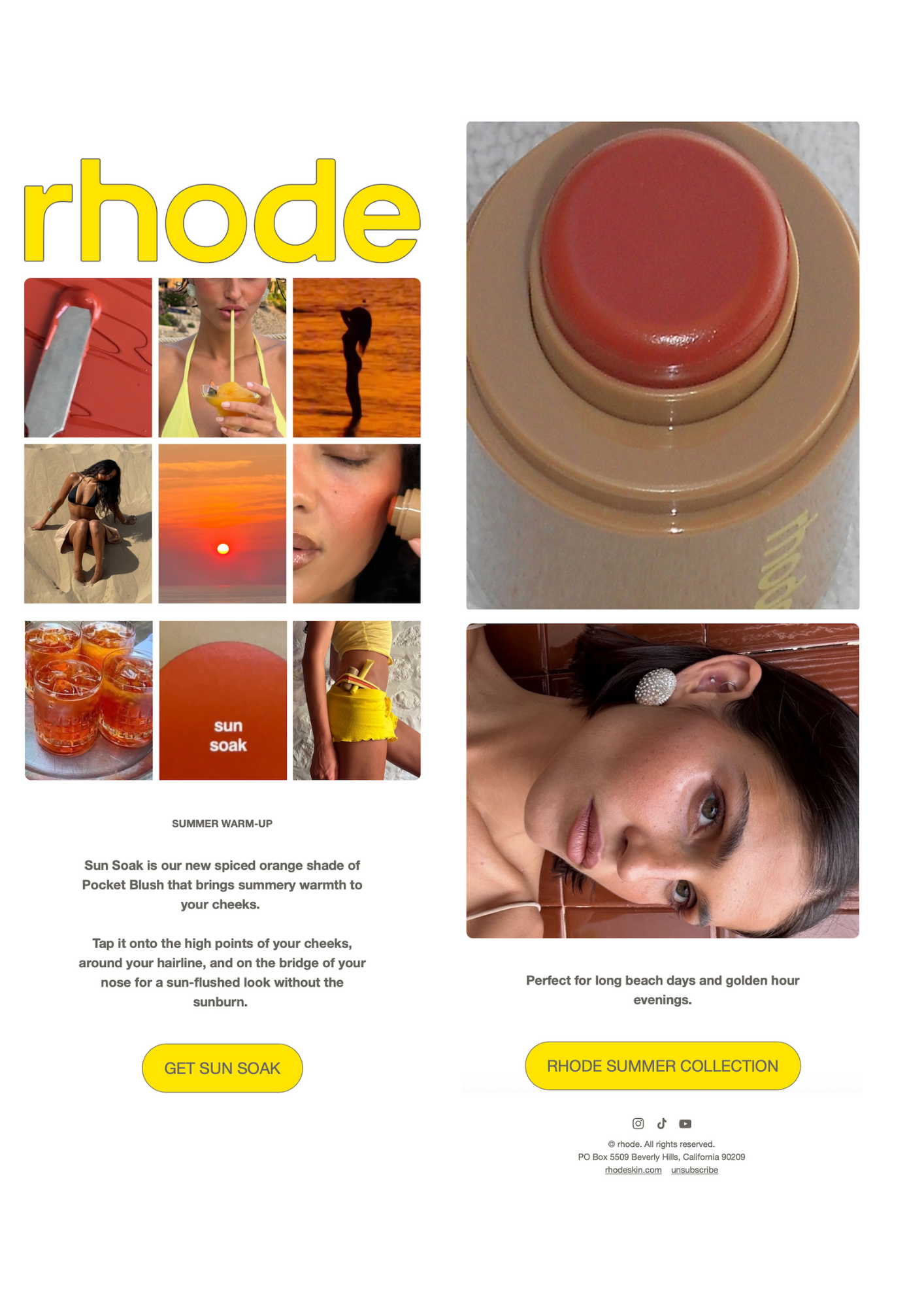 Here’s where rhode show the power of campaign consistency. Their yellow summer theme runs across their website, socials, and emails—creating one big brand moment.