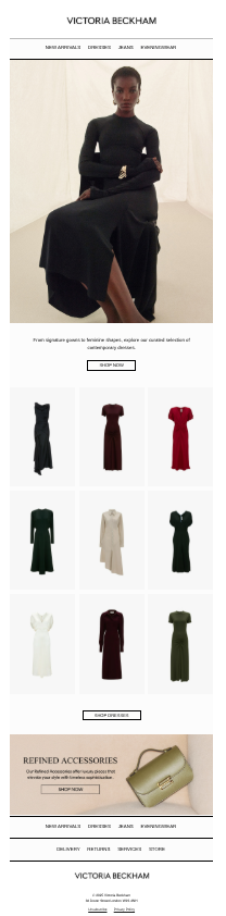 Dresses are clearly a core category for Victoria Beckham, as they are for most womenswear brands, so leading with a dedicated dresses edit makes perfect sense. It’s also smart to include a banner at the bottom highlighting a complementary category, giving customers a secondary route to explore without distracting from the main story. The design hierarchy works well here, making it clear this is a supporting message rather than the hero focus.