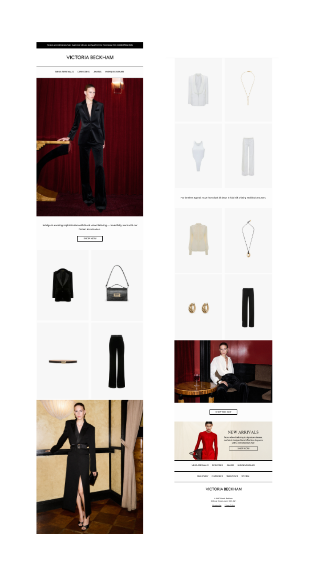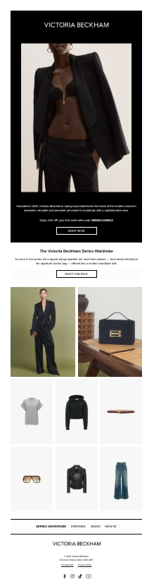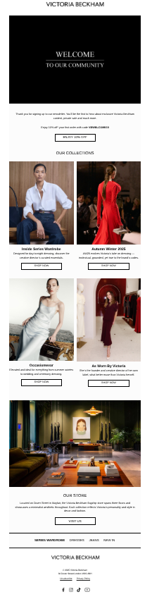 The welcome email opens with striking, minimalist imagery and very little copy. The focus is immediate and intentional. This is the world of Victoria Beckham, and the aesthetic does the heavy lifting.